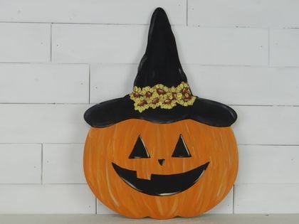 A pumpkin wearing a witch hat door hanger, or use the smaller sizes on wreaths or the HOME signs.